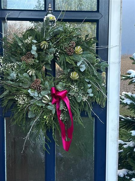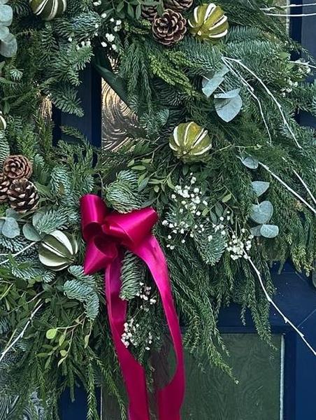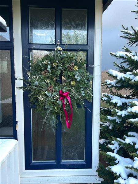 The Stunning Door wreath is the perfect finishing touch to your Christmas decorations. Measuring over 60 cm and made of fresh foliage, spruce, pine, eucalyptus, cones and dried fruits. Finished of with a beautiful ribbon.