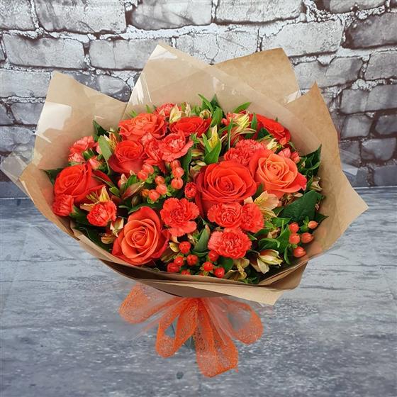A warm and cheerful Christmas bouquet filled with glowing orange roses, festive carnations, and seasonal berries, all arranged with rich green foliage for a bright and joyful look. Perfect for adding a vibrant touch to the season.