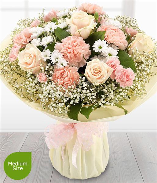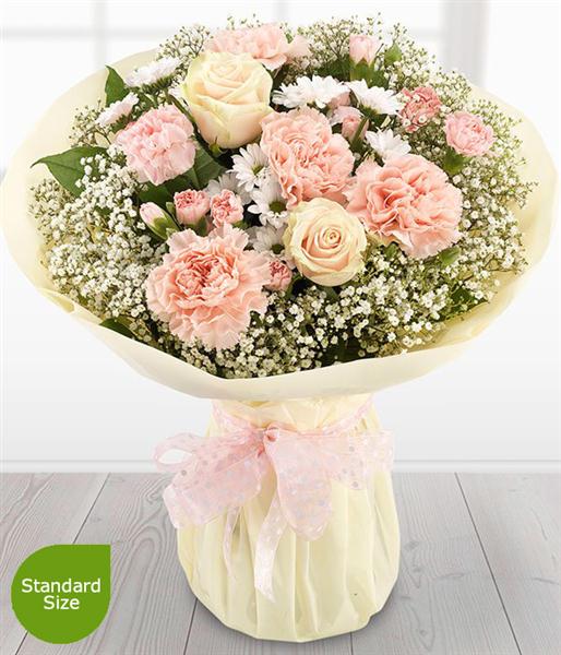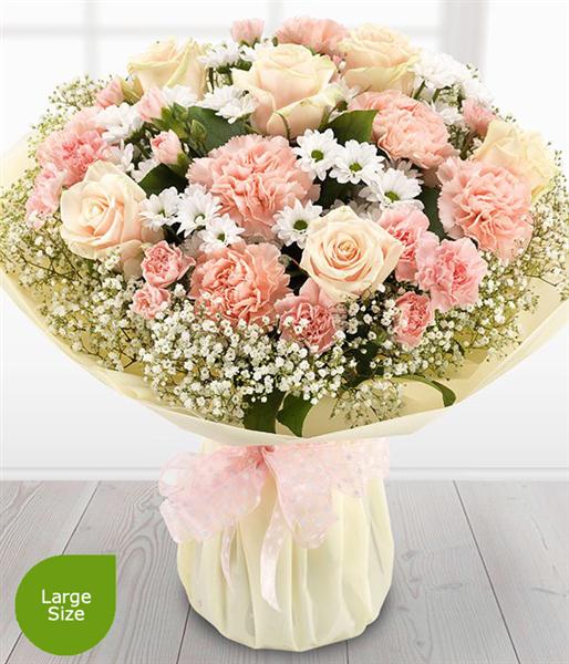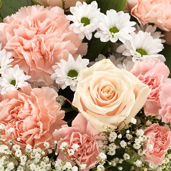 Includes Oyster Roses, White Gypsophilia, White Spray Chrysanthemums, Pink Carnations, Pink Spray Carnations, Salal.