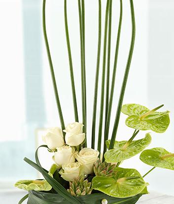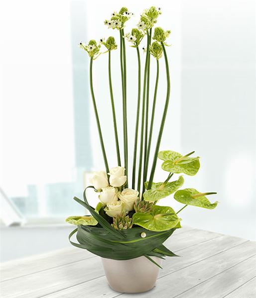 Includes White Chincherinchee, White Rose, Green Anthurium Lily, Succulent Plant, Aspidistra Leaf, China Grass.