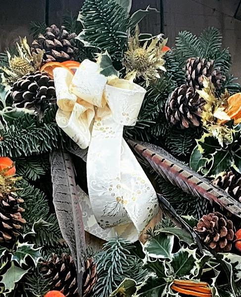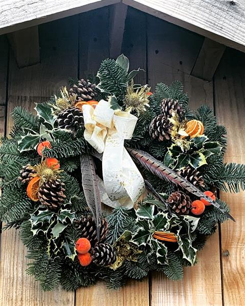 Beautiful fully decorated pine and holly wreath, fully decorated with pheasant tails