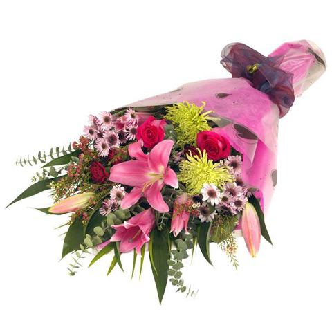 A traditional style bouquet of mixed pink flowers including Roses, Carnations, Lilies and Chrysanthemums, packaged for easy arrangement at home.