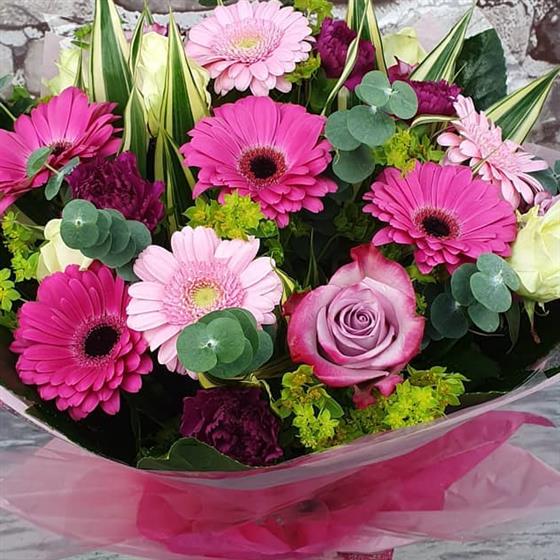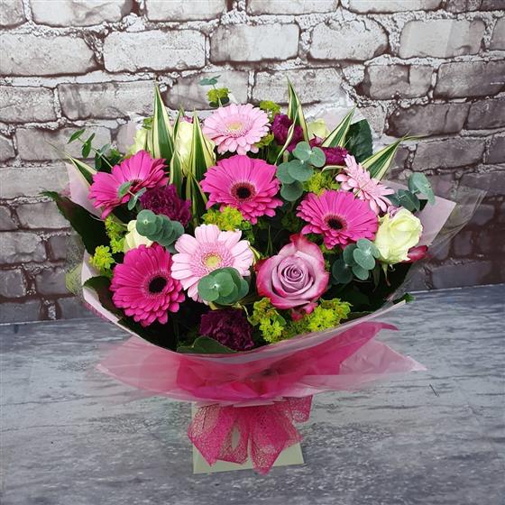 A cheerful Christmas arrangement filled with vibrant pinks, soft lilacs and fresh winter greens. Designed with a bright festive style, perfect for adding colour and happiness to the season.