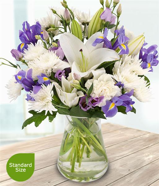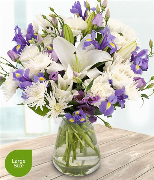 An incredibly beautiful bouquet of white Lilies, Spray Chrysanthemums and Carnations mixed with blue Irises and lilac Lisianthuses.