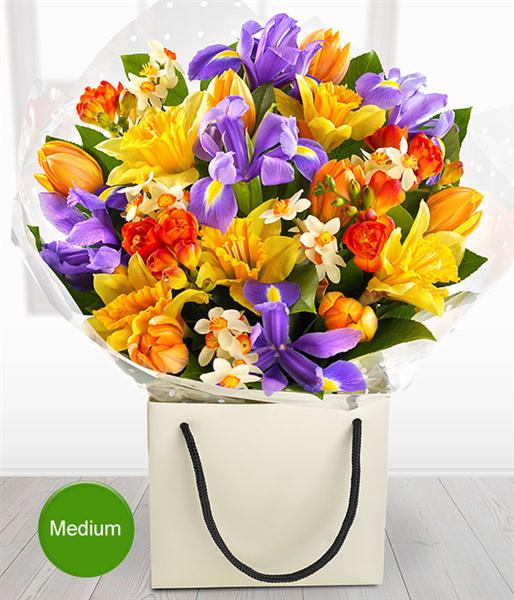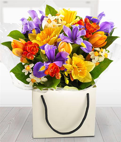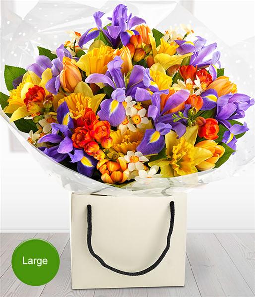 Go for WOW with this incredible spring flower Arrangement. Daffodils, Narcissi, Tulips, Iris and beautifully fragrant Freesia.