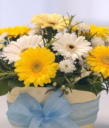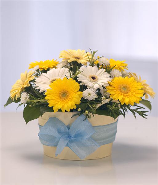 This delightful modern arrangement of complementary shades of yellow Gerbera, Germini, Montbretia and foliage is presented in a lemon coated galvanised tin container with organza bow detail.