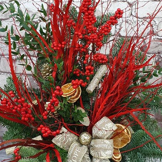 A striking Christmas arrangement filled with vibrant red berries, seasonal evergreens and tall festive twigs, finished with touches of dried orange and a luxury ribbon. Designed to bring bold colour and classic winter warmth into the home for the holiday season.