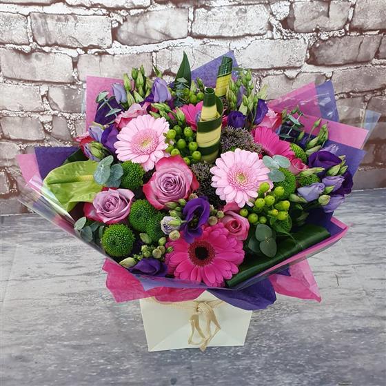 A vibrant bouquet filled with fresh pinks, purples and lush greens. Bold, cheerful and full of colour, arranged using fresh flowers and natural style for everyday gifting.