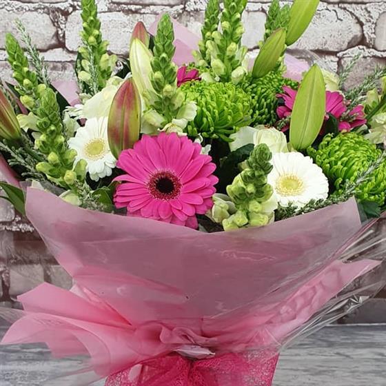 A cheerful Christmas arrangement filled with bright pink blooms, soft winter whites and fresh green accents. Designed in a lively festive style, perfect for bringing colour and joy to the holiday season.