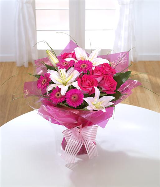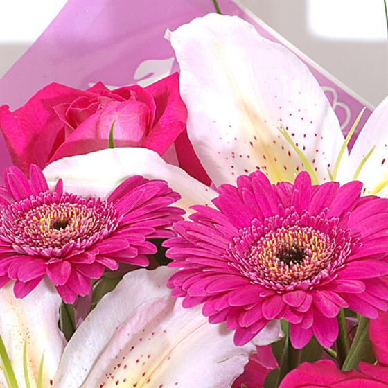 Rose, Lily and Germini hand-tied aquapack featuring hot cerise Roses and mini Gerbera.
