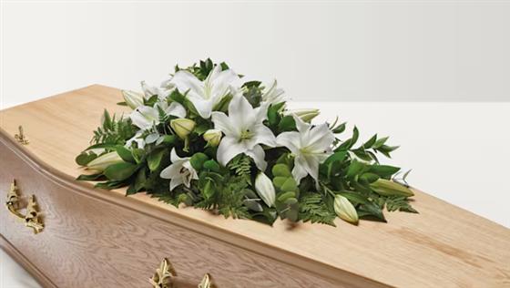 A medium, traditional spray that includes an abundance of fresh white lilies and delicate foliage exuding simplicity.