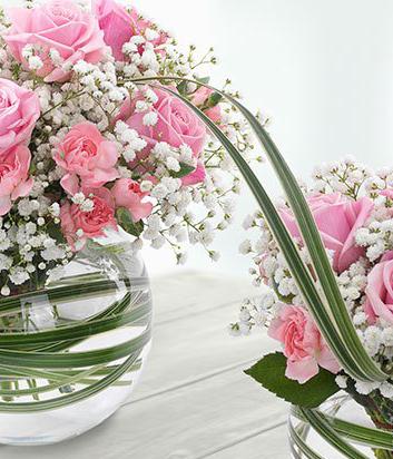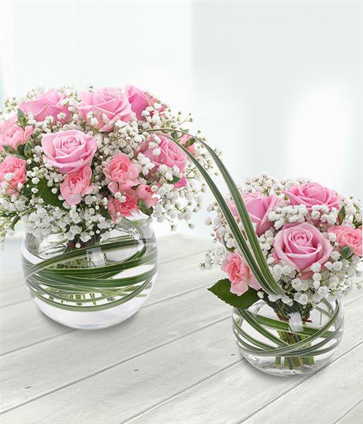 Pretty pink Roses, Spray Carnations and white Gypsophila perfectly presented in a spherical glass vase and connected to a mini glass vase by Variegated China Grass. A really lovely gift representing mother and daughter.