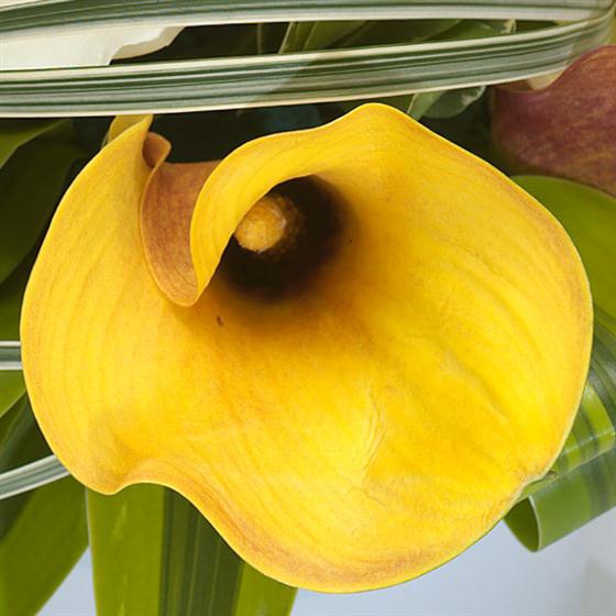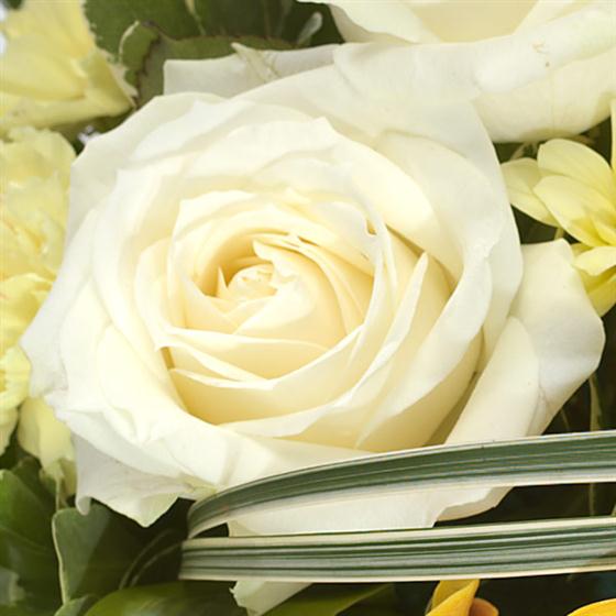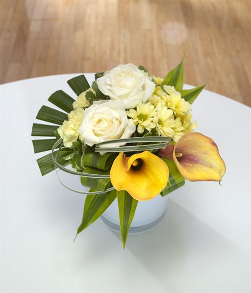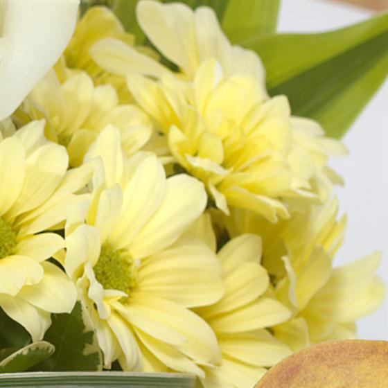 A natural collar of foliage is the base for this glorious golden arrangement. Flowers are grouped for effect - cream Roses, gold Calla Lilies, yellow Carnations and cream spray Chrysanthemums.