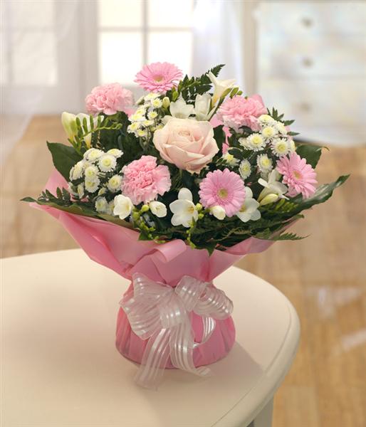 Pink and cream Roses, Gerbera and Freesias are the stars of this scented hand-tied bouquet, delivered in an aqua pack.