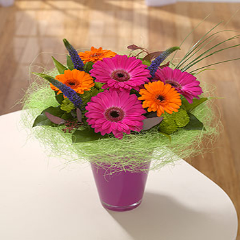 This contemporary design is bursting with vibrant orange and pink Gerbera and framed with a zesty lime green collar. Blue Veronica and Bear Grass add distinction to this elegant arrangement delivered in a vase.