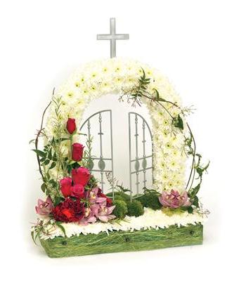 White Chrysanthemum based 'Gates of Heaven' design with pink spray, including Roses, exotic Orchids, Carnations and complementary foliage.