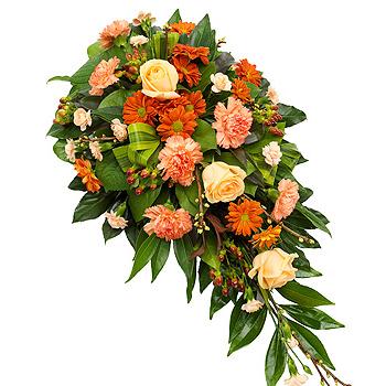 A beautiful orange and peach single ended spray. Roses, Chrysanthemums, Carnations and bronze Hypericum sit perfectly alongside variegated red and lime Dracaena, Aralia leaves, Cocculus, Salal and Cherry Blossom.