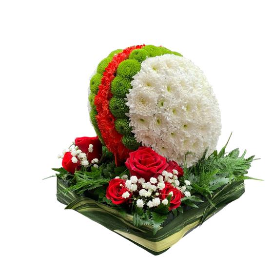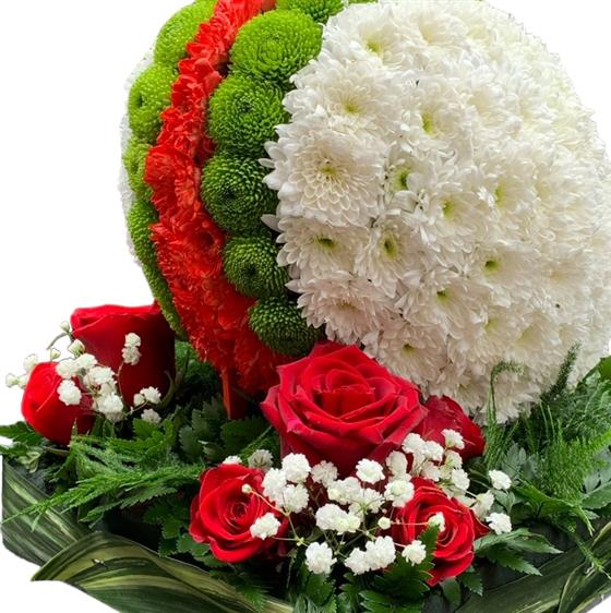 A 3D rugby ball tribute created using white spray Chrysanthemums, red and white spray Carnations and Moss.